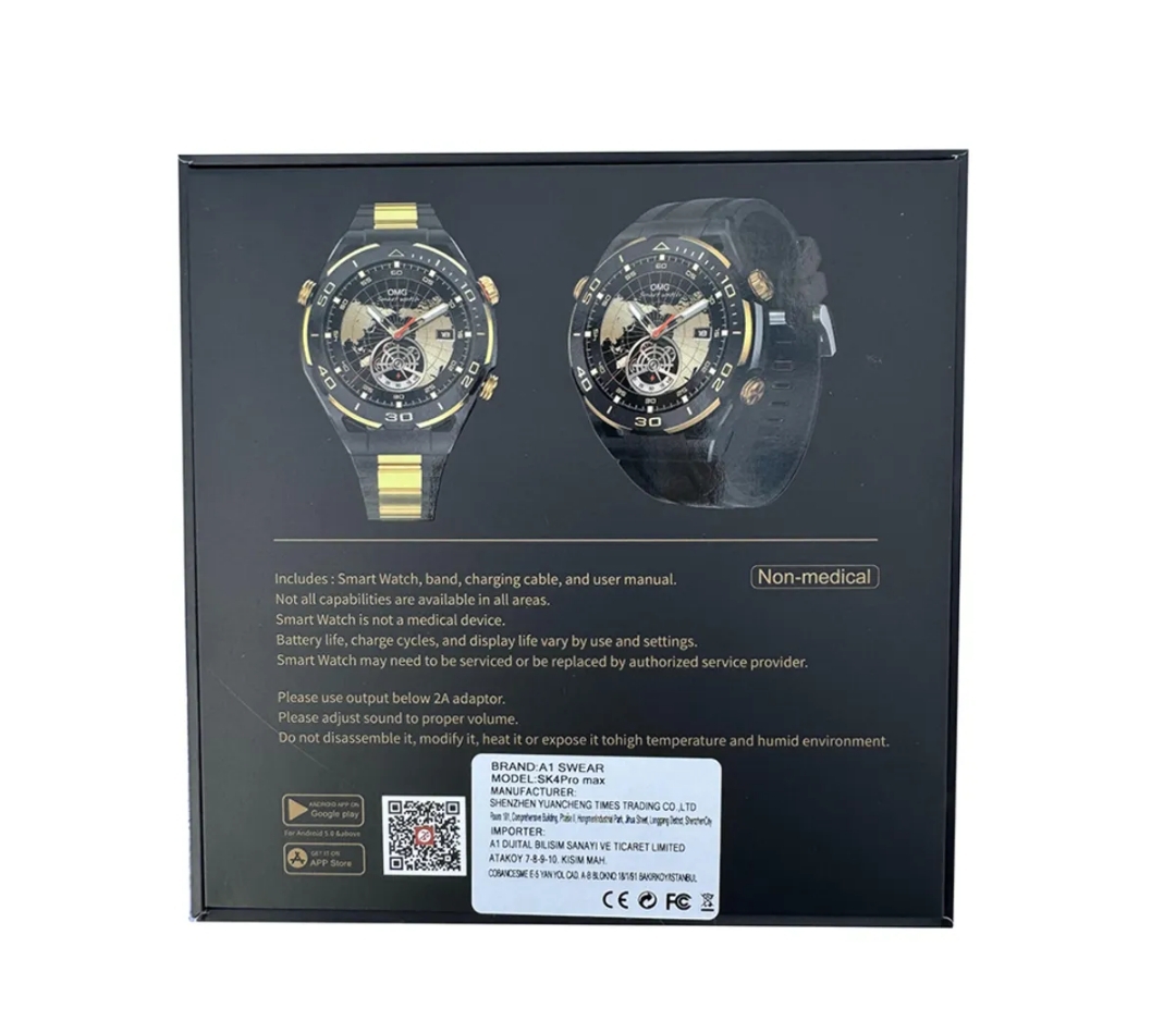 Kutu İçeriği: SK4 PRO MAX Akıllı Saat + 2 Adet Kordon Metal + Silikon + Wireless Şarj Kablosu + Kullanma Kılavuzu