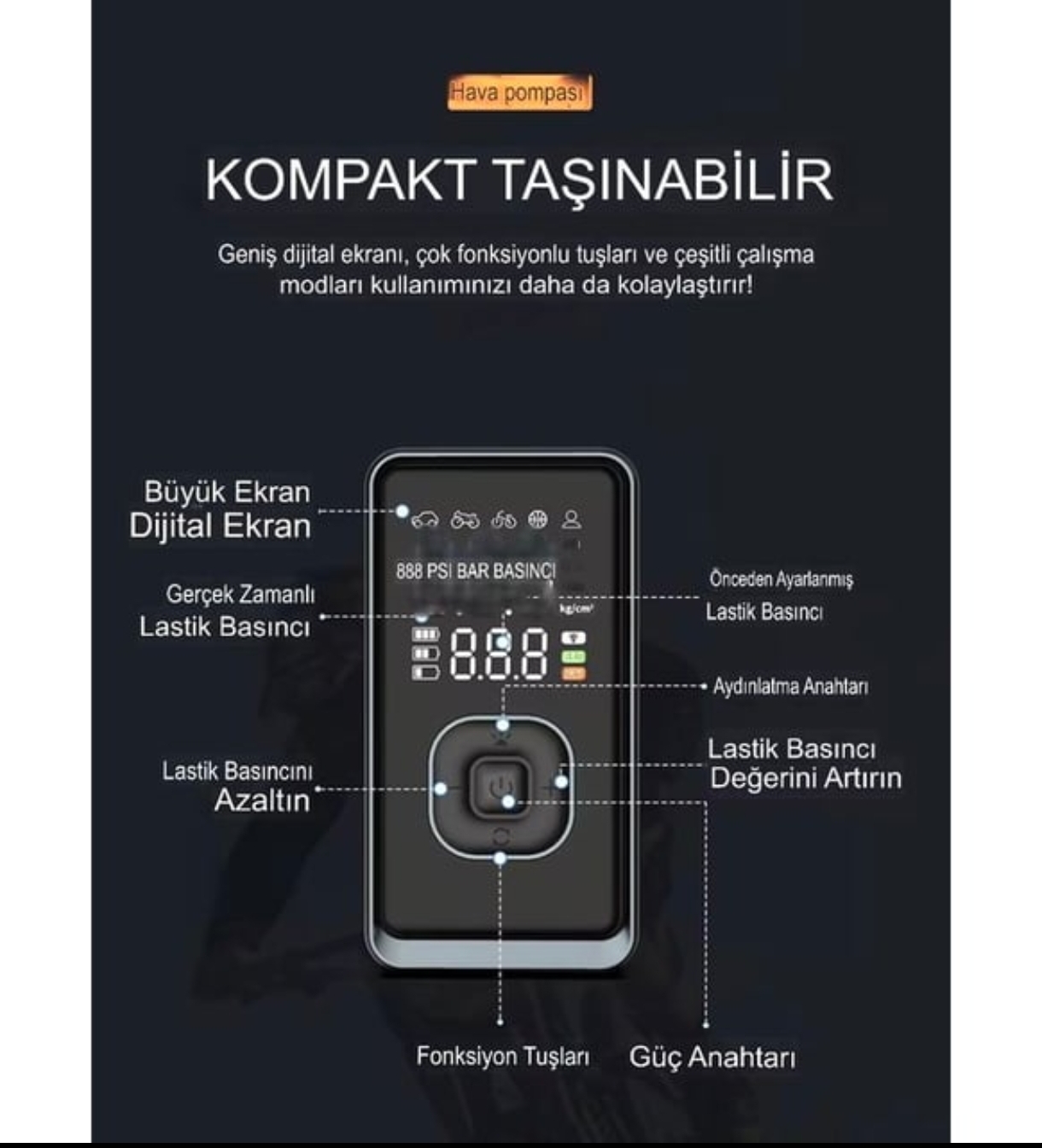 Çantalı 8000mAh 150 PSI Akü Takviyeli Oto Bisiklet Motosiklet Hava Kompresörü Lastik Şişirme Pompası Yeni nesil akü takviyeli taşınabilir hava pompası, hem lastiklerinizi şişirir hem de acil durumlarda aracınıza enerji verir. Kompakt, hafif ve güçlü yapısıyla araç bagajınızda, motosiklet çantanızda ya da evde her zaman elinizin altında!